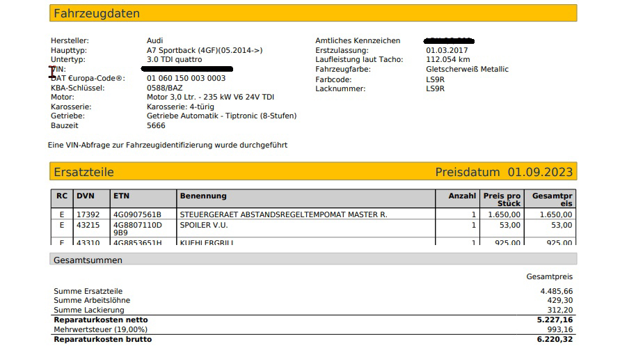 Ein vollständig dokumentierter Kostenvoranschlag nach Herstellervorgaben ist völlig ausreichend und bei den Versicherungen gerne gesehen. Eine schnelle Abwicklung ist dann die Konsequenz. Es entstehen absolut vertretbare Kalkulationskosten im Vergleich zu einem Gutachten. Die Schadenhöhe unterscheidet sich dabei nicht.
